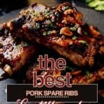 Juicy Costillas de Puerco (Pork Spare Ribs) marinated with garlic and a flavorful blend of spices, baked until deliciously tender and fall-off-the-bone.
