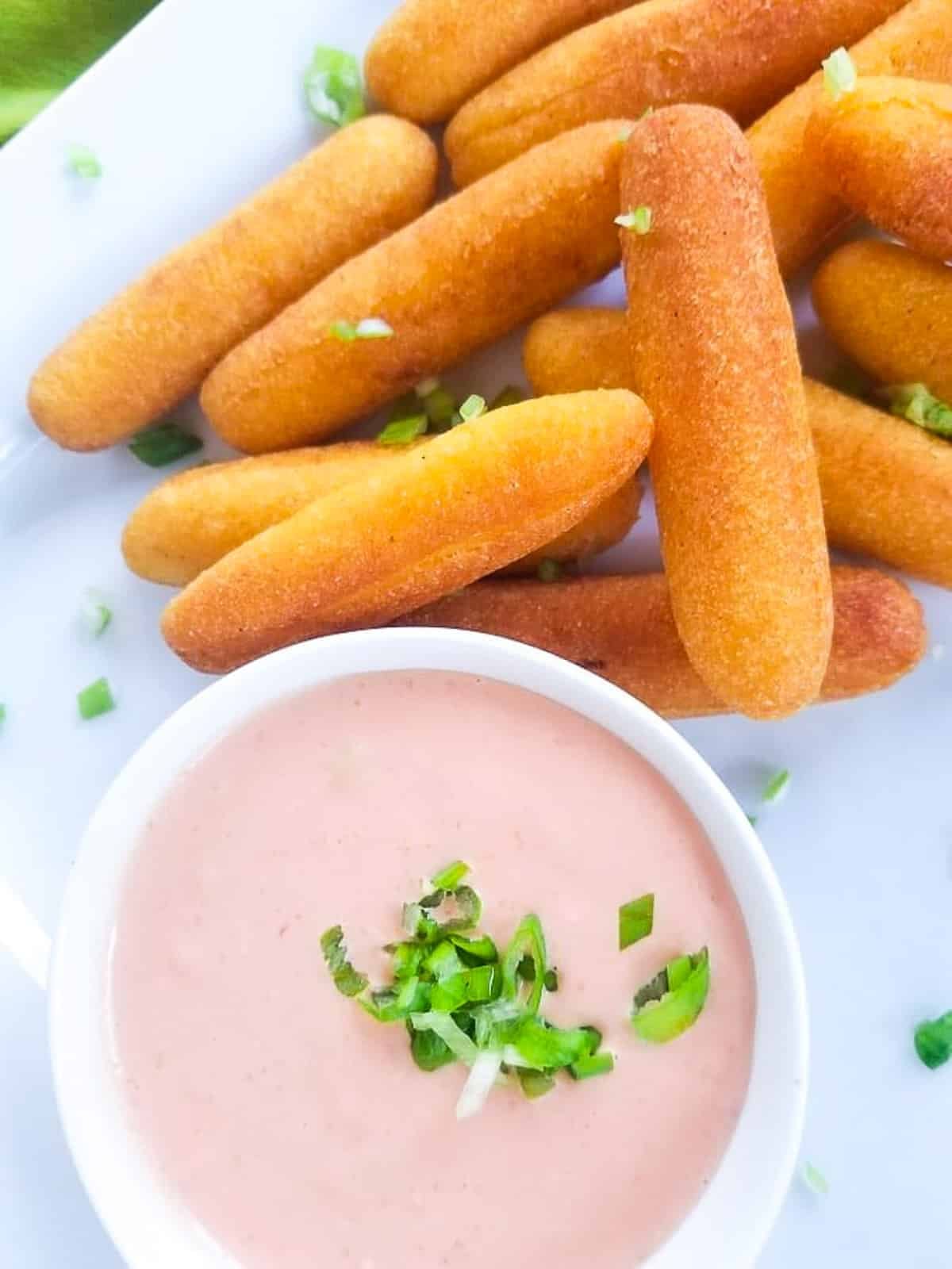 - While the second batch is frying, mix together mayonnaise, ketchup, and a little garlic to make a quick Mayoketchup sauce. Serve alongside the sorullitos and enjoy!